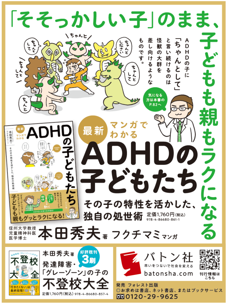 日経新聞に広告掲載『最新 マンガでわかるADHDの子どもたち』 2026年2月22日 最終更新日時 : 2026年2月27日 中 📚『最新 マンガでわかるADHDの子どもたち』2026年2月22日付の日本経済新聞に、『最新 マンガでわかるADHDの子どもたち』(本田秀夫・著/フクチマミ・マンガ)の広告を掲載しました。 発達特性への理解が、より広く社会に届くことを願っています✨ 投稿者プロフィール 中 「バトン社」の広報担当兼編集者です 最新の投稿 メディア紹介2026年2月25日発達ナビ 『【精神科医・本田秀夫】ADHDの特性の表れ方は十人十色!苦手を「大目に見る」「要所を押さえる」コツ』 新聞広告2026年2月22日日経新聞に広告掲載『最新 マンガでわかるADHDの子どもたち』 新刊案内2026年2月20日成人ADHD診断が10年で21.1倍に*(信州大学調査)“子ども期支援”の重要性を問う新刊『最新 マンガでわかるADHDの子どもたち』2/20発売 メディア紹介2026年2月18日発達ナビ 『【精神科医・本田秀夫】「もう○歳だから」「やればできる」はNG!?ADHDの子を追い詰める年齢基準と120%の要求』 Follow me! FacebookXBlueskyHatenaLINECopy