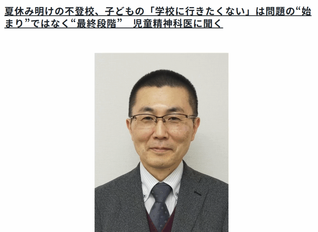 詳細はこちら➡夏休み明けの不登校、子どもの「学校に行きたくない」は問題の“始まり”ではなく“最終段階” 児童精神科医に聞く